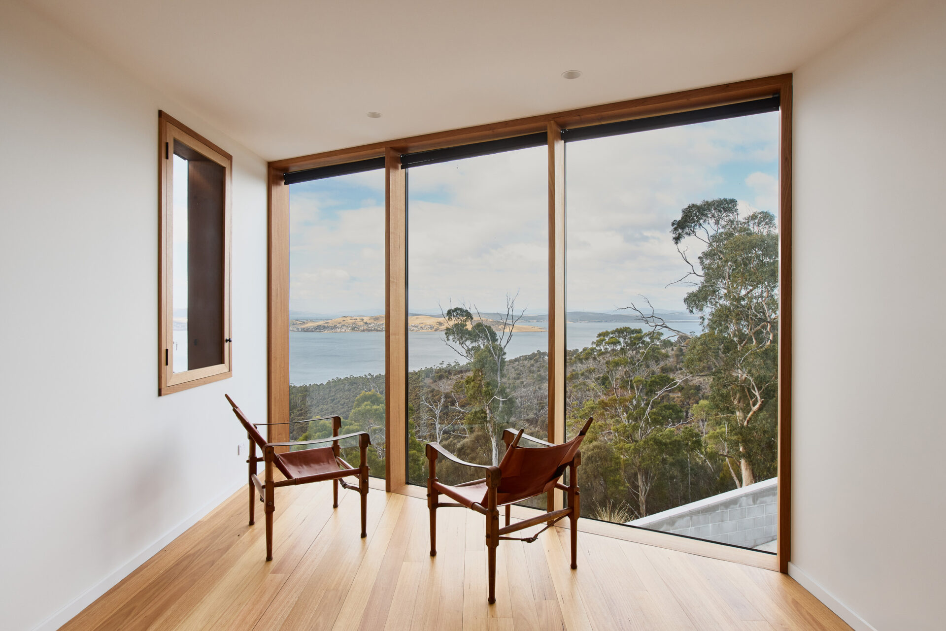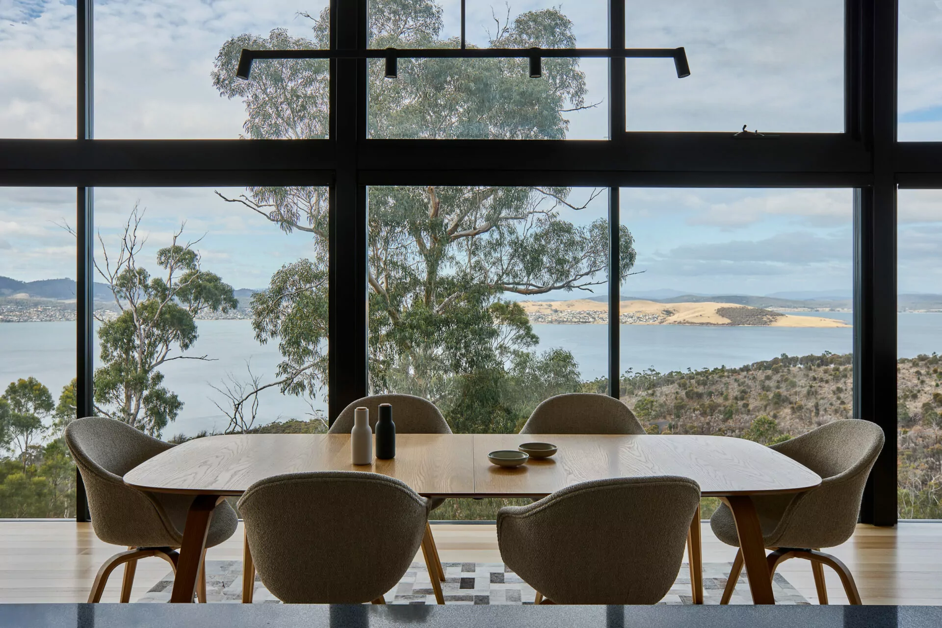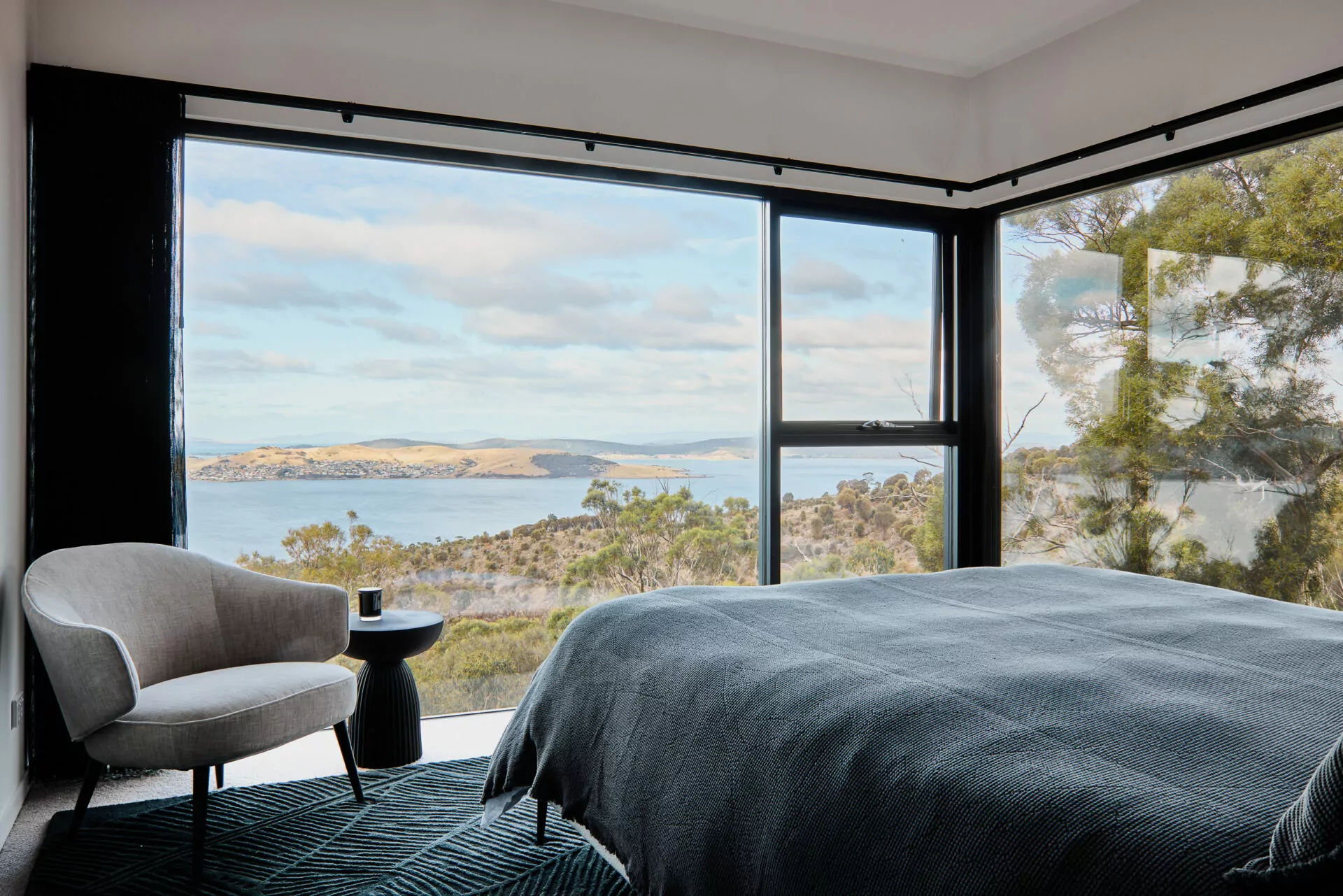 In harmony with the spectacular view, the kitchen and dining space keeps things pared back – sleek black joinery, matte finishes and soft timber tones throughout create a calm, practical backdrop to everyday living or entertaining with friends.The round windows found in the project break away from the home’s otherwise linear glazing, offering something unexpected, drawing in natural light and adding function, character and a subtle shift in rhythm that makes all the difference.