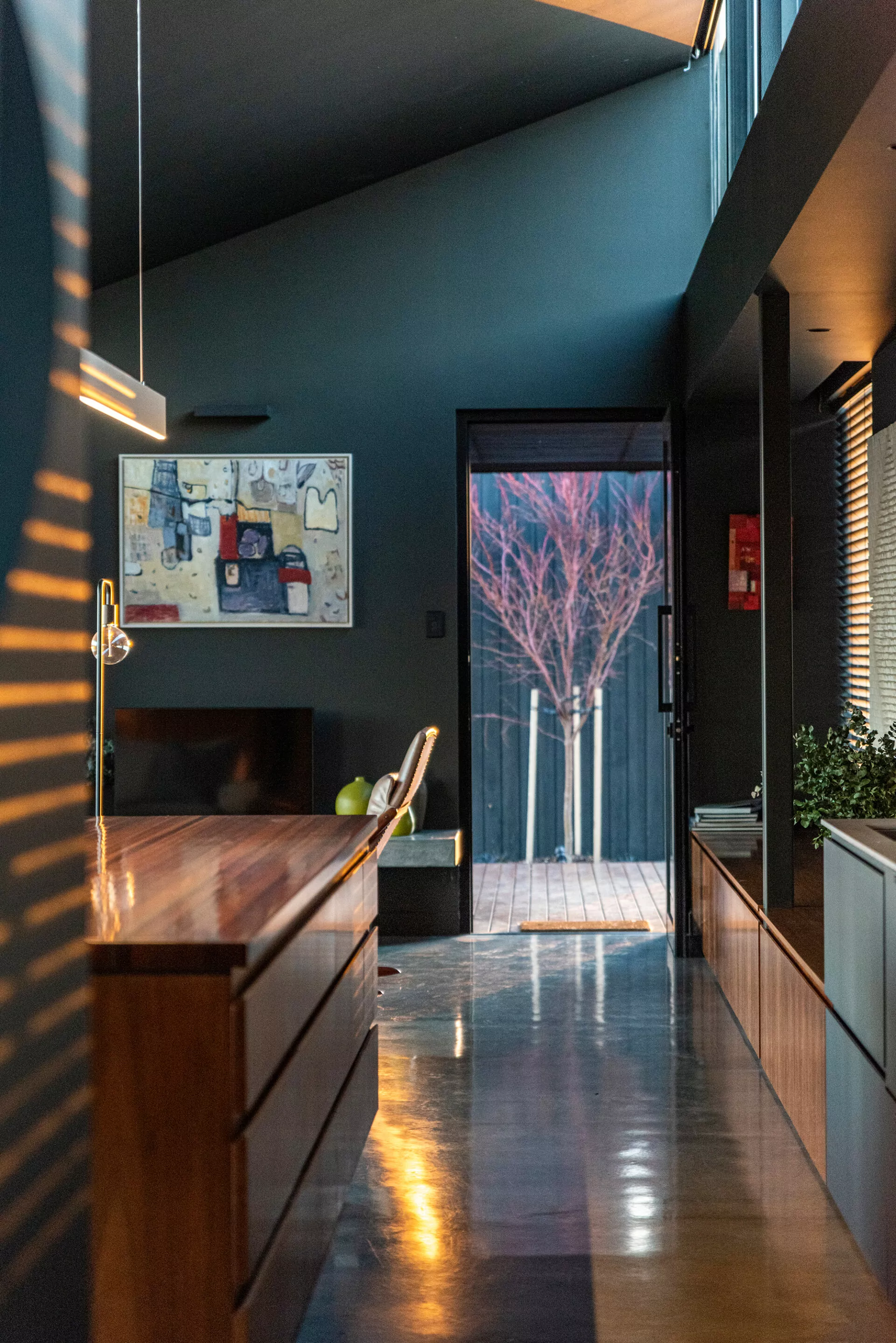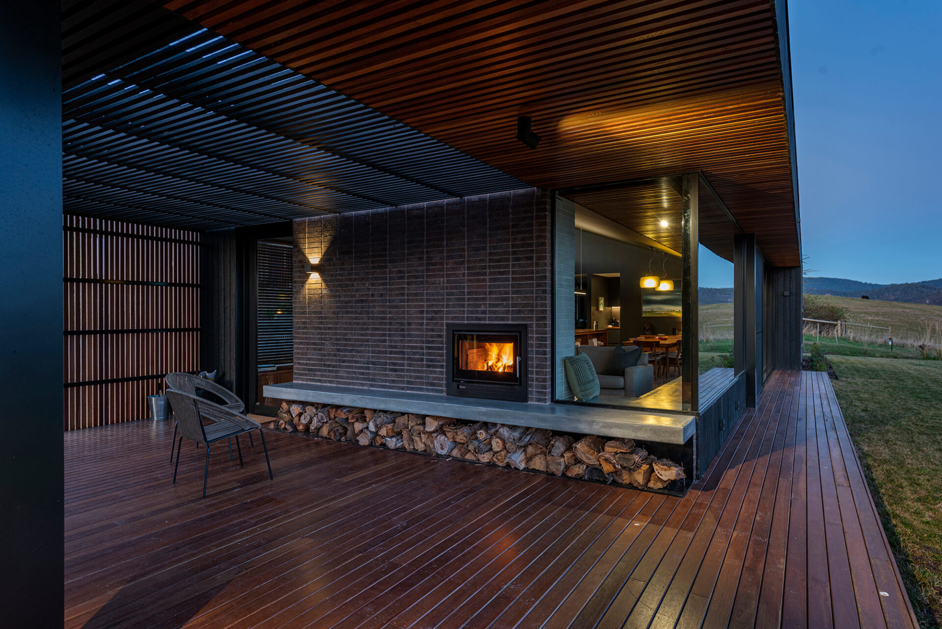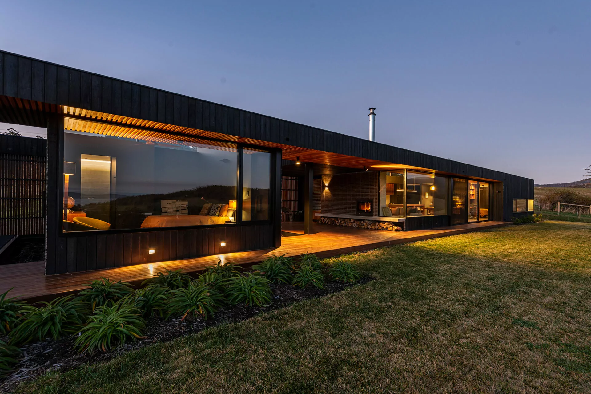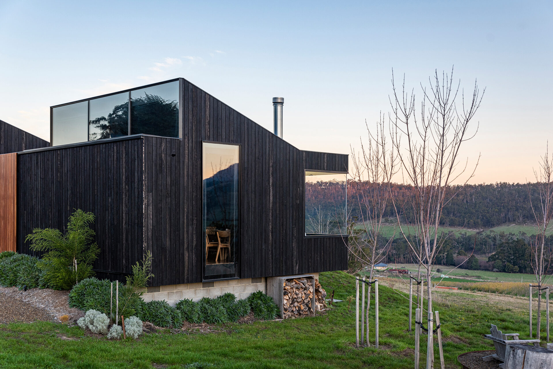 Nestled just below a picturesque ridge, this single-storey residence extends from east to west, offering breathtaking rural vistas that stretch southward over Port Cygnet and beyond, and invigorated by the crisp oxygen of the countryside. Clad in striking Shou sugi ban timber, its exterior sits as a shadow in the landscape, while lofty ceilings soar overhead, allowing ample northern sunlight to flood in through expansive clerestory windows, casting idyllic reflections of the surrounding hills and pastures.