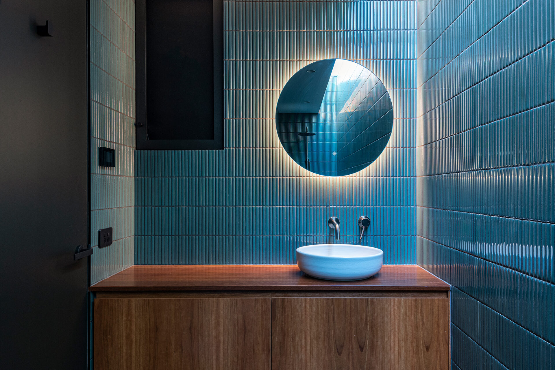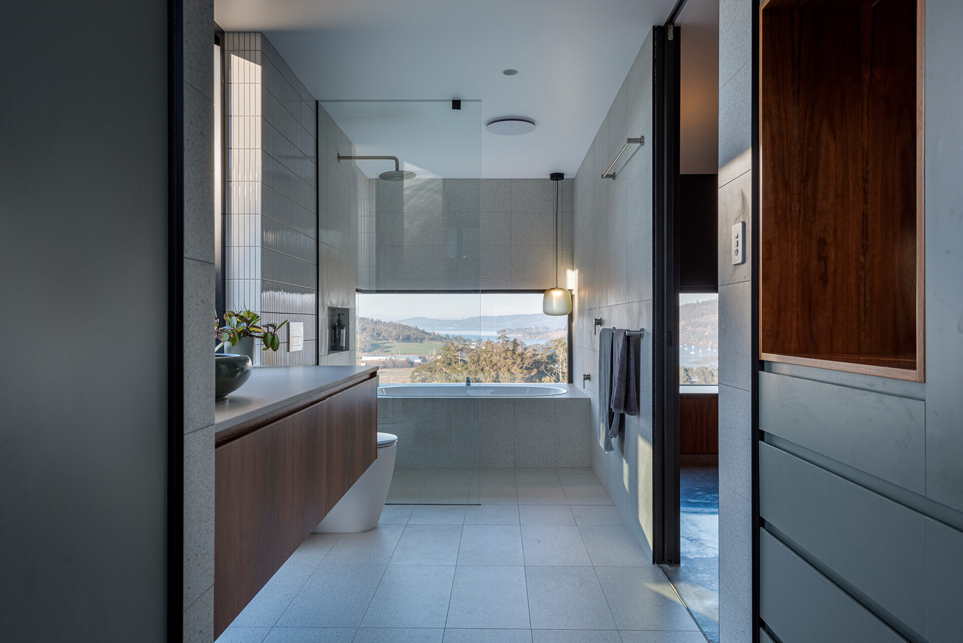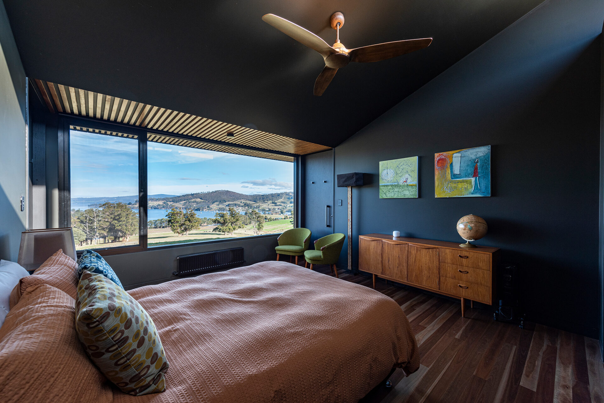 The primary bedroom enjoys both acoustic and spatial separation from the communal areas, nestled behind a functional utilities block housing a mudroom, pantry, and study. Framed by an ensuite and dressing room, this sanctuary offers tranquil views of a sculptural tree on the nearby paddock hill, while a strategically positioned corner window invites sweeping rural vistas and glimpses of the winding river from the indulgent bath.